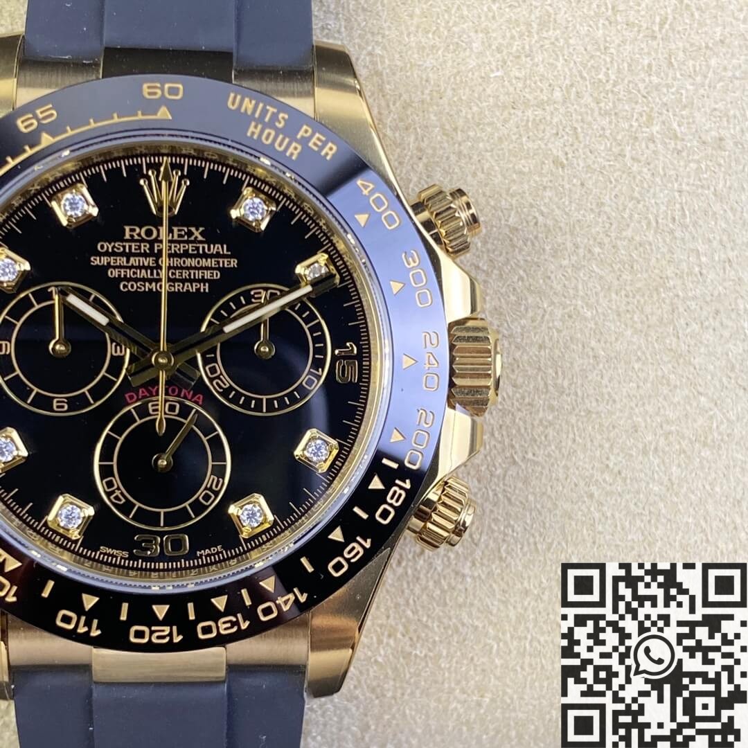 The Rolex Cosmograph Daytona 4130 M116518LN-0046 Yellow Gold Watch by Clean Factory is a perfect blend of elegance and performance. This exquisite replica features an 18k yellow gold case paired with a black ceramic bezel and a striking black Oysterflex strap, embodying both luxury and sporty aesthetics. Designed with precision, this 1:1 replica faithfully mirrors the original, making it an exceptional choice for watch enthusiasts and collectors.