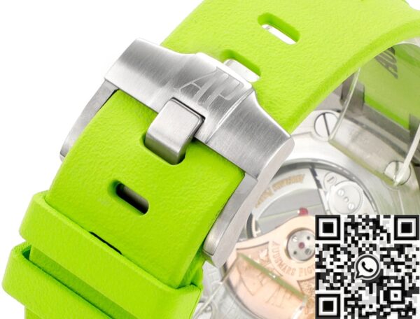 The vibrant yellow-green Panda dial is the standout feature of this Royal Oak Offshore model. The dial contrasts beautifully with black sub-dials, giving the watch a sleek and modern appearance. The reverse panda layout enhances legibility, with the chronograph sub-dials placed at 9 o’clock (seconds), 12 o’clock (minutes), and 6 o’clock (hours). The distinctive yellow-green hue adds a refreshing touch, ensuring that this watch is noticed at every glance.