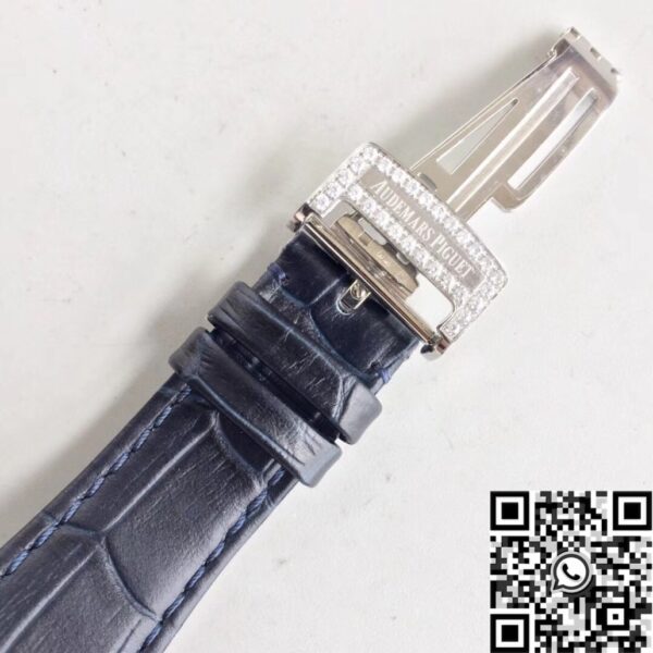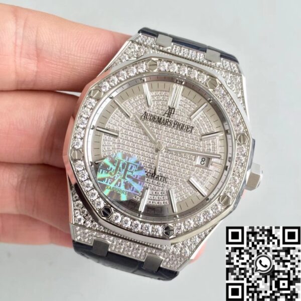This Royal Oak timepiece is powered by a Swiss automatic movement, ensuring precise timekeeping and reliable performance. The movement guarantees smooth operation, allowing the watch to keep accurate time for many years. The transparent sapphire case back offers a view of the intricate workings inside, showcasing the exceptional craftsmanship that defines Audemars Piguet.