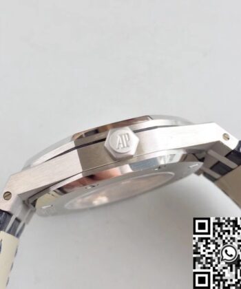 The silver dial features the iconic Tapisserie pattern, which is a hallmark of the Royal Oak collection. This finely crafted design adds depth and texture to the dial, while the silver-tone hour markers and hands enhance the watch’s readability. The design catches the light beautifully, giving the watch a sophisticated gleam that draws attention without being overbearing.