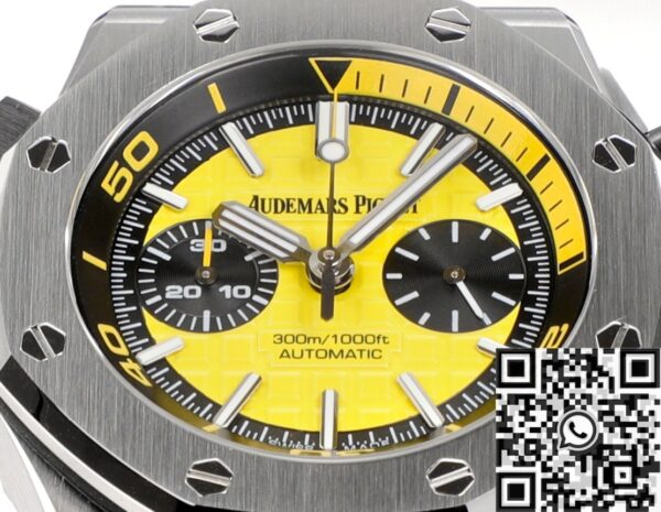 The standout feature of the Audemars Piguet Royal Oak Offshore 26703ST.OO.A051CA.01 is its eye-catching yellow Panda dial. The bold yellow dial is complemented by black sub-dials at 9, 12, and 6 o’clock, offering a stylish contrast and enhancing readability. This reverse Panda dial layout adds a modern touch to the watch, making it a versatile choice for both formal and casual occasions.