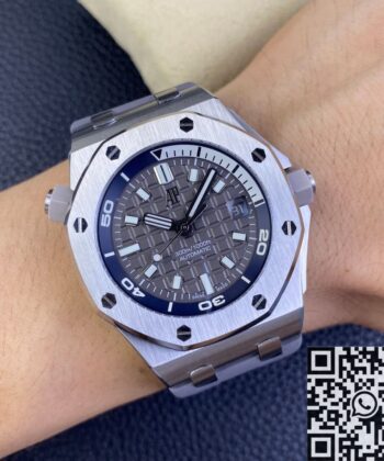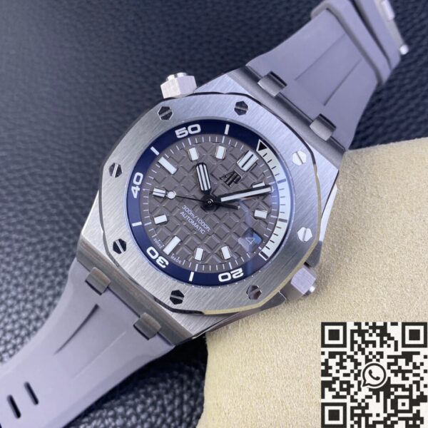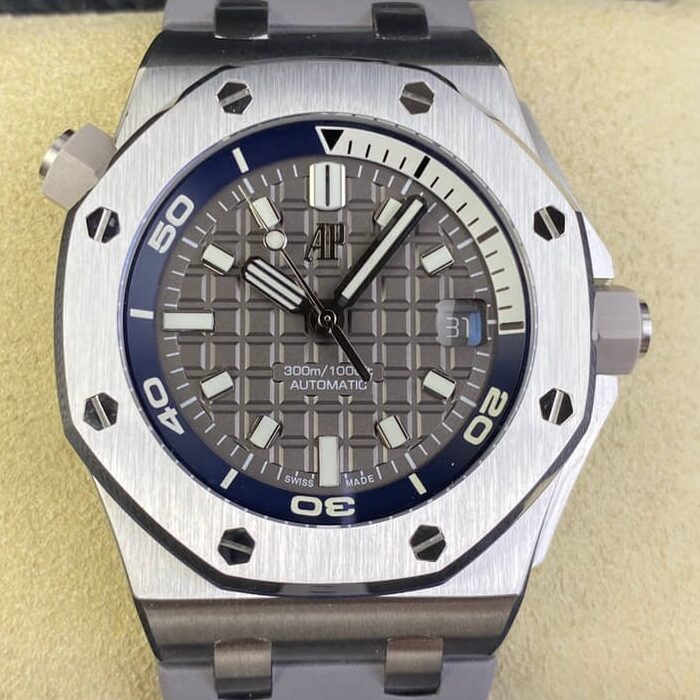 Crafted from high-grade stainless steel, the case offers durability and a polished, modern look. The iconic octagonal bezel is secured with visible hexagonal screws, giving it that signature Royal Oak Offshore character. The integrated grey rubber strap enhances the sporty feel while ensuring a comfortable fit on the wrist.