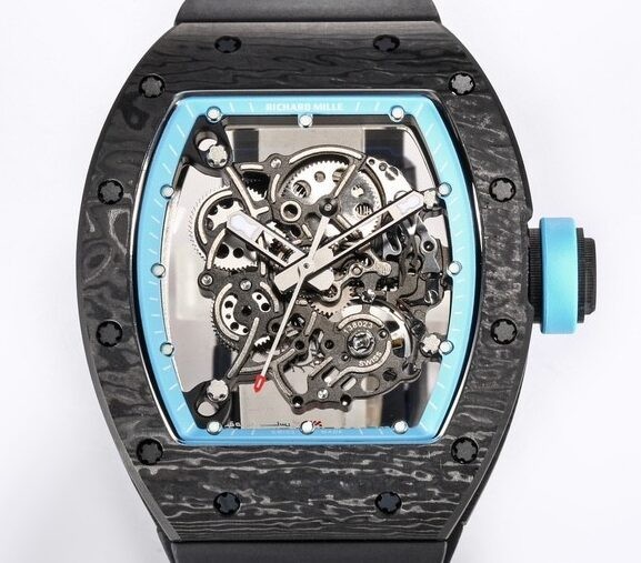 - With its futuristic design and impeccable craftsmanship, the RM055 is a must-have for fashion-forward individuals. The striking blue dial and carbon fiber case ensure you stand out from the crowd, no matter the occasion.