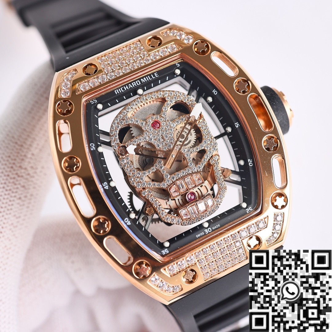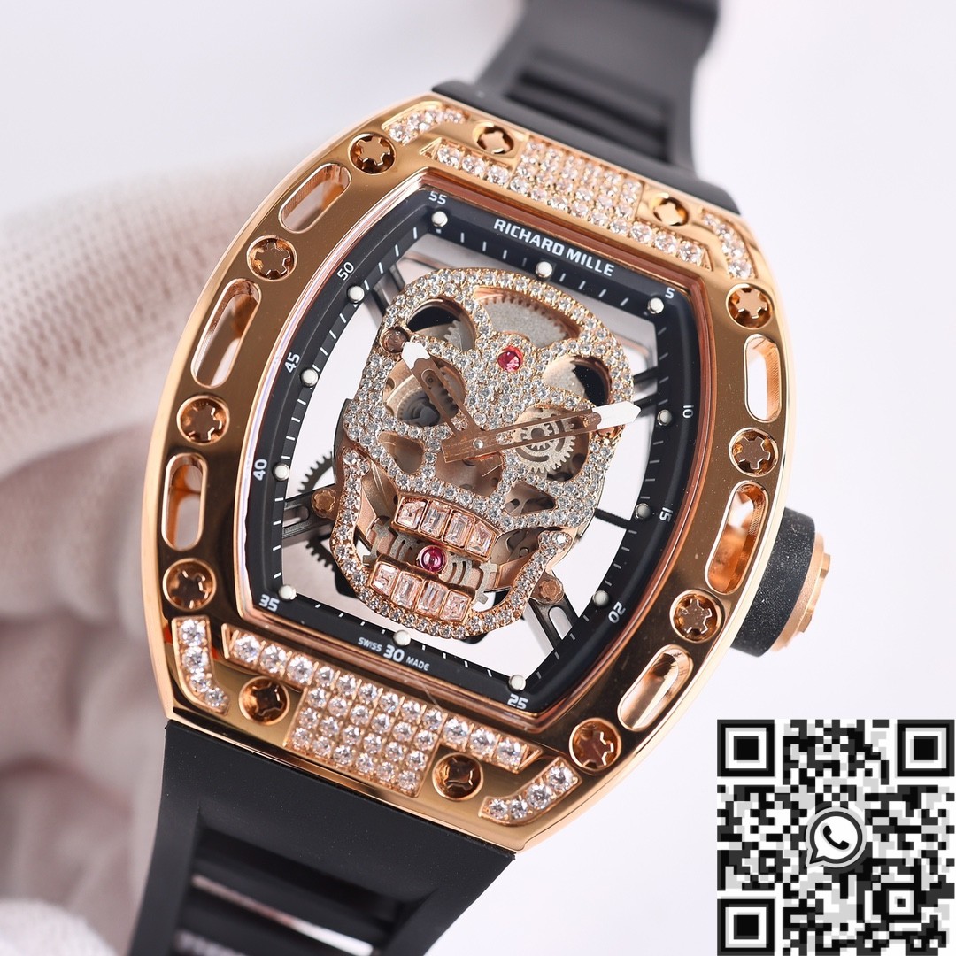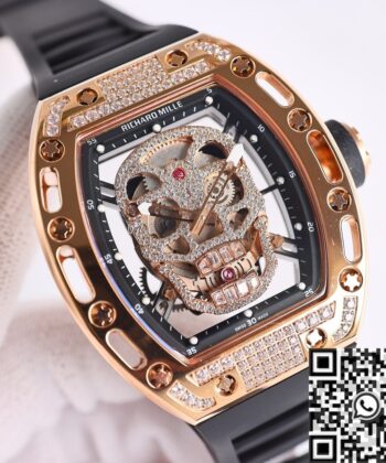 The CN Watches RM052 Richard Mille Rose Gold Diamond Watch is a bold masterpiece that fuses avant-garde design with opulent craftsmanship. With its iconic skull motif, full diamond-set rose gold case, and skeletonized mechanical movement, this timepiece is made for those who dare to stand out.