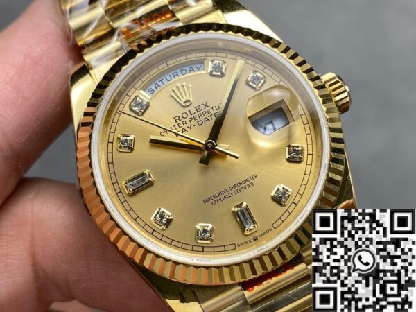 The Rolex Day Date M128238-0008 Diamond Scale 36mm Watch Q Factory is the ideal timepiece for anyone looking for a blend of elegance, luxury, and functionality. Its stunning diamond scale dial, luxurious gold case, and precise movement make it a perfect addition to any collection or an ideal piece for daily wear.