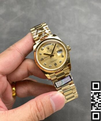The Day Date Rolex Diamond M128238-0008 Diamond Scale 36mm Watch from Q Factory embodies the perfect fusion of luxury, precision, and timeless style. This exquisite timepiece is designed with a diamond-scale dial that adds a level of sophistication and opulence, making it a true collector’s item.