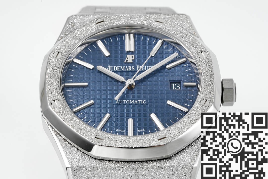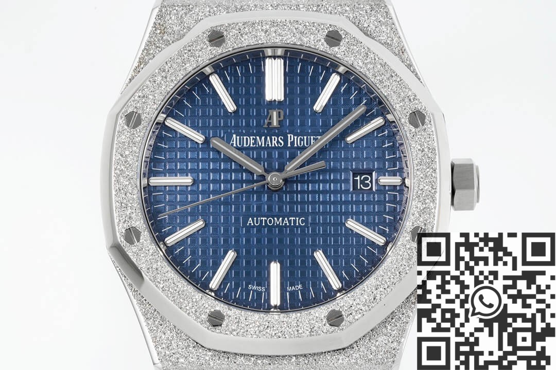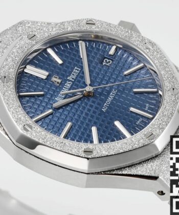 The Audemars Piguet Royal Oak 15410BC.GG.1224BC.01 is a striking example of craftsmanship, featuring a frosted 18ct white gold case and bracelet. The frosted finish gives the watch a unique texture, with a sparkling effect that reflects light beautifully. This innovative finishing process was created in collaboration with Italian jeweler Carlo Bassi, resulting in a luxurious yet subtle shine that sets the watch apart from other timepieces.