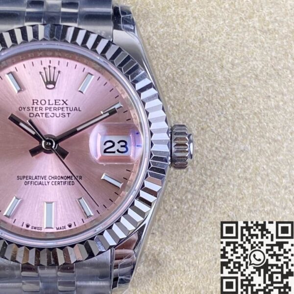 The dial is adorned with the signature “Datejust” layout, featuring luminous hour markers and hands that ensure clear readability, even in low-light conditions. A date window at 3 o’clock is magnified by the iconic Cyclops lens, making it easy to read the date at a glance. The combination of the smooth, polished bezel and the stunning pink dial makes this timepiece both versatile and fashionable.