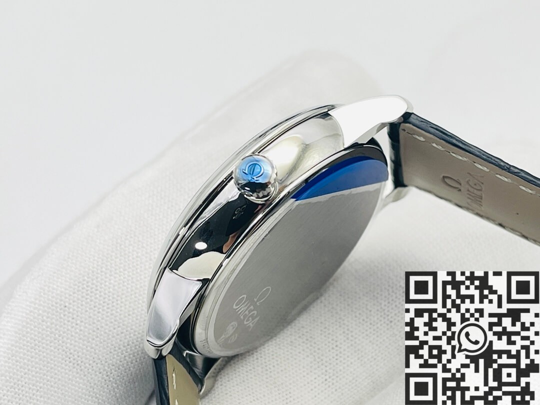 - Dial: The white dial is clean and minimalistic, with silver-tone hour markers and hands. The simplicity of the design, paired with the elegant Omega logo at 12 o’clock, ensures legibility while maintaining an air of sophistication. The date window at 6 o’clock adds a functional touch to the design.