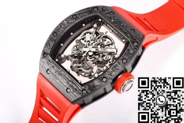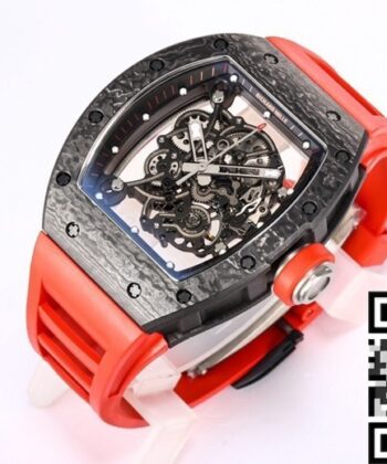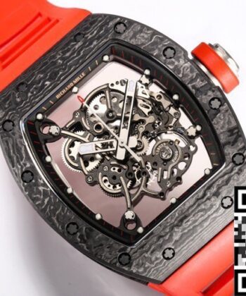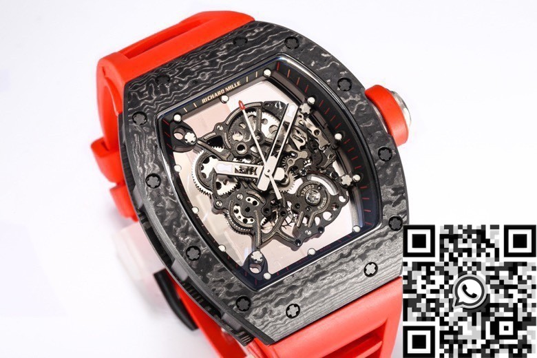 - With its vibrant red strap, skeletonized dial, and sleek black carbon case, the RM055 is a statement piece that adds boldness and elegance to any outfit. Whether you’re dressing for a professional setting or a casual gathering, this watch effortlessly blends style with functionality.