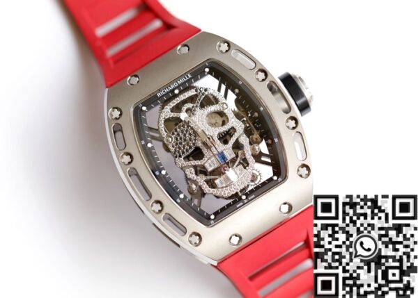 The Richard Mille RM052 Diamond Skull Red Rubber Strap Watch from EUR Factory is an extraordinary timepiece that combines cutting-edge design with the technical mastery of Richard Mille. Featuring a diamond skull dial, manual-winding tourbillon movement, and a striking red rubber strap, it is a must-have for those who value unique, high-end watches. This 1:1 high-quality replica brings the exceptional craftsmanship and bold design of Richard Mille to a more affordable level, offering an incredible blend of luxury and innovation.