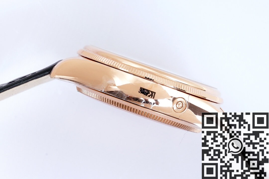The dark alligator leather band adds a touch of luxury to the watch and is comfortable for daily wear. The strap is secured by an 18k Everose Gold pin buckle to ensure that the watch stays securely on your arm.