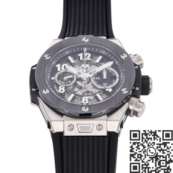 Ceramic Bezel Design: The Hublot BIG BANG Unico 421.NM.1170.RX features a ceramic bezel, enhancing the watch’s scratch resistance and modern aesthetic. Ceramic is known for its lightness and high hardness, offering a unique tactile feel while reflecting Hublot’s innovative spirit.